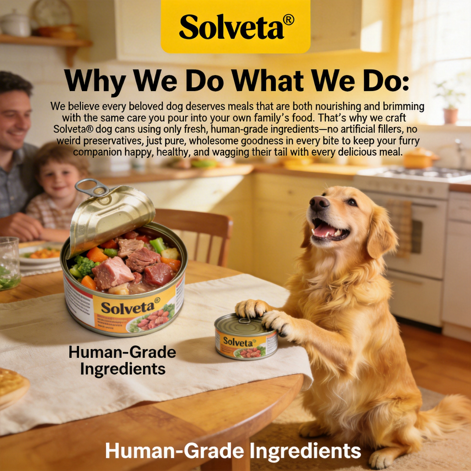 Why We Do What We Do: We believe every beloved dog deserves meals that are both nourishing and brimming with the same care you pour into your own familyās food. Thatās why we craft SolvetaĀ® dog cans using only fresh, human-grade ingredientsāno artificial fillers, no weird preservatives, just pure, wholesome goodness in every bite to keep your furry companion happy, healthy, and wagging their tail with every delicious meal.