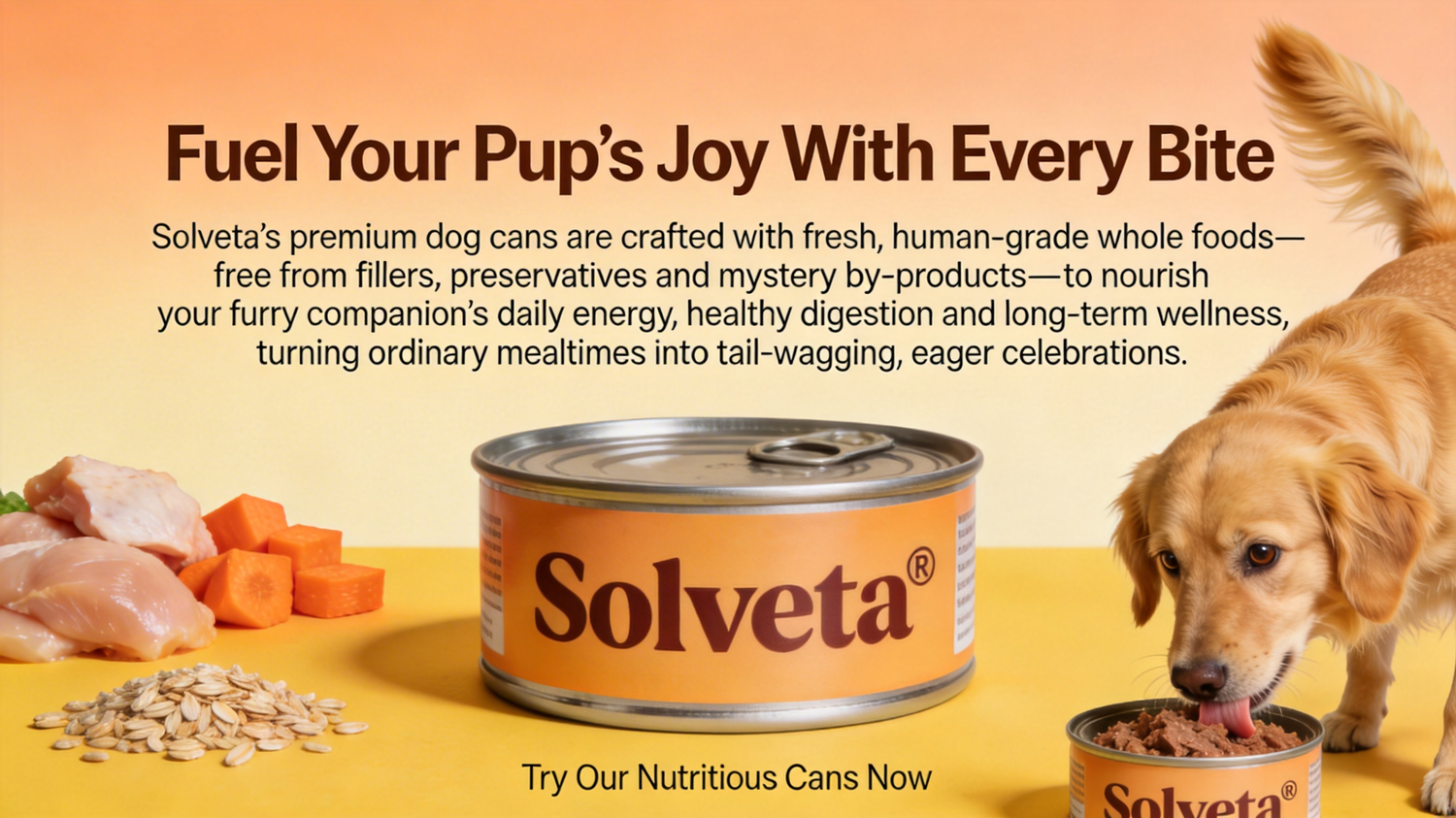 ļ¼Fuel Your Pupās Joy With Every Bite. Solvetaās premium dog cans are crafted with fresh, human-grade whole foodsāfree from fillers, preservatives and mystery by-productsāto nourish your furry companionās daily energy, healthy digestion and long-term wellness, turning ordinary mealtimes into tail-wagging, eager celebrations. Try Our Nutritious Cans Now